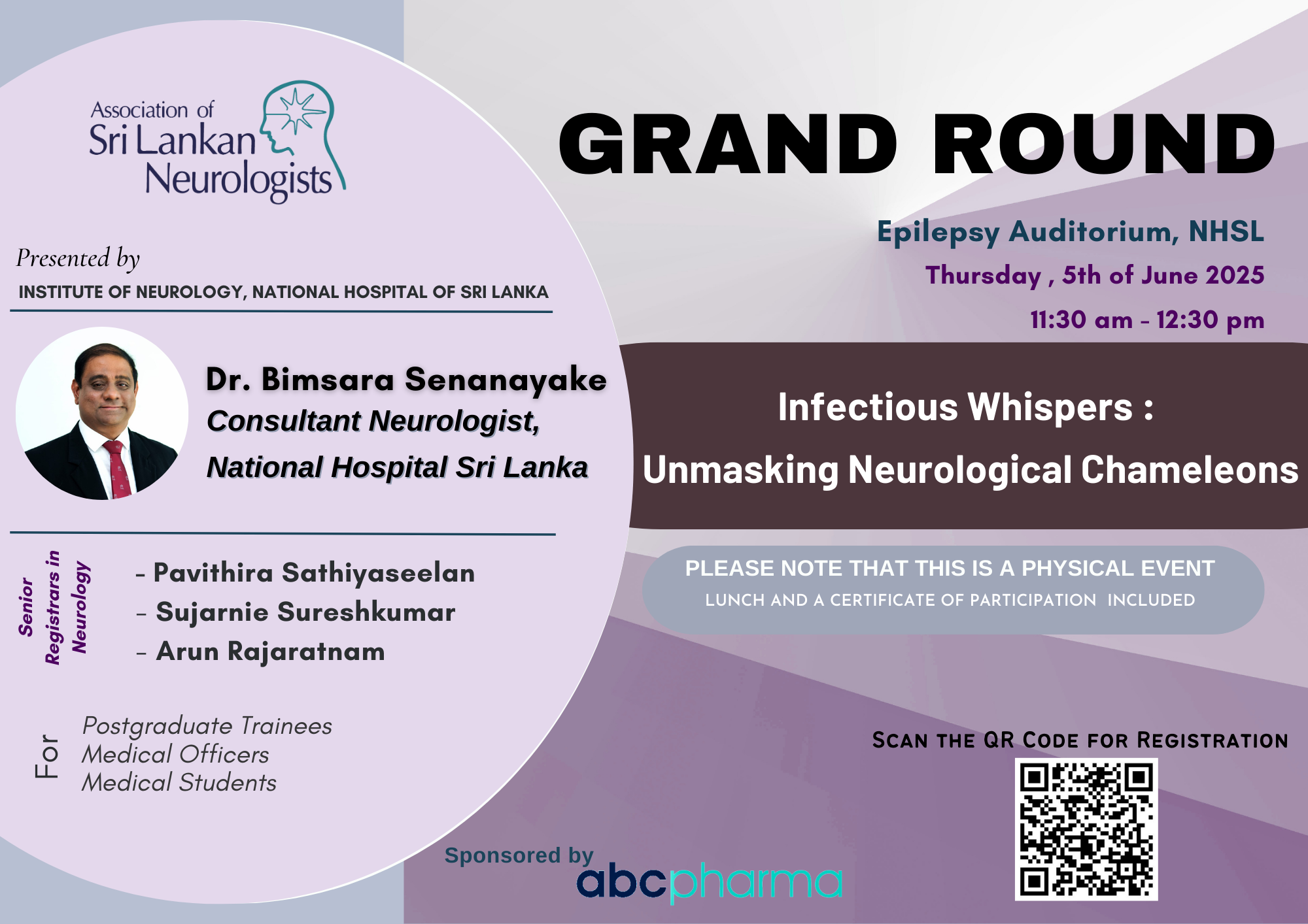The Association of Sri Lankan Neurologists conducts a series of monthly Grand Rounds at the ClinMARC Auditorium of the National Hospital of Sri Lanka.