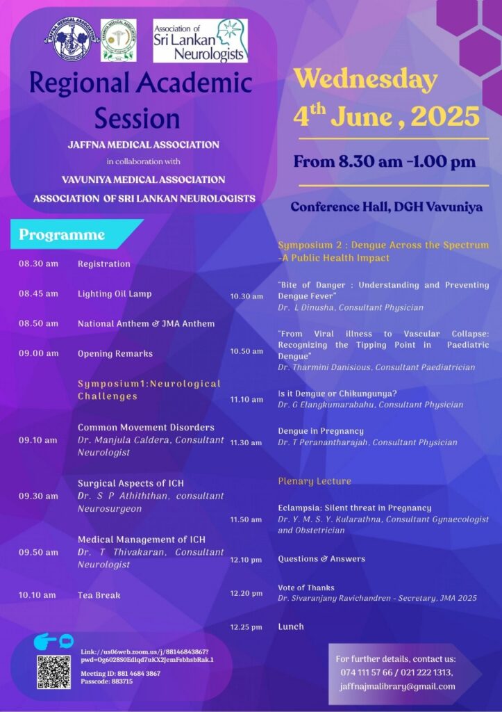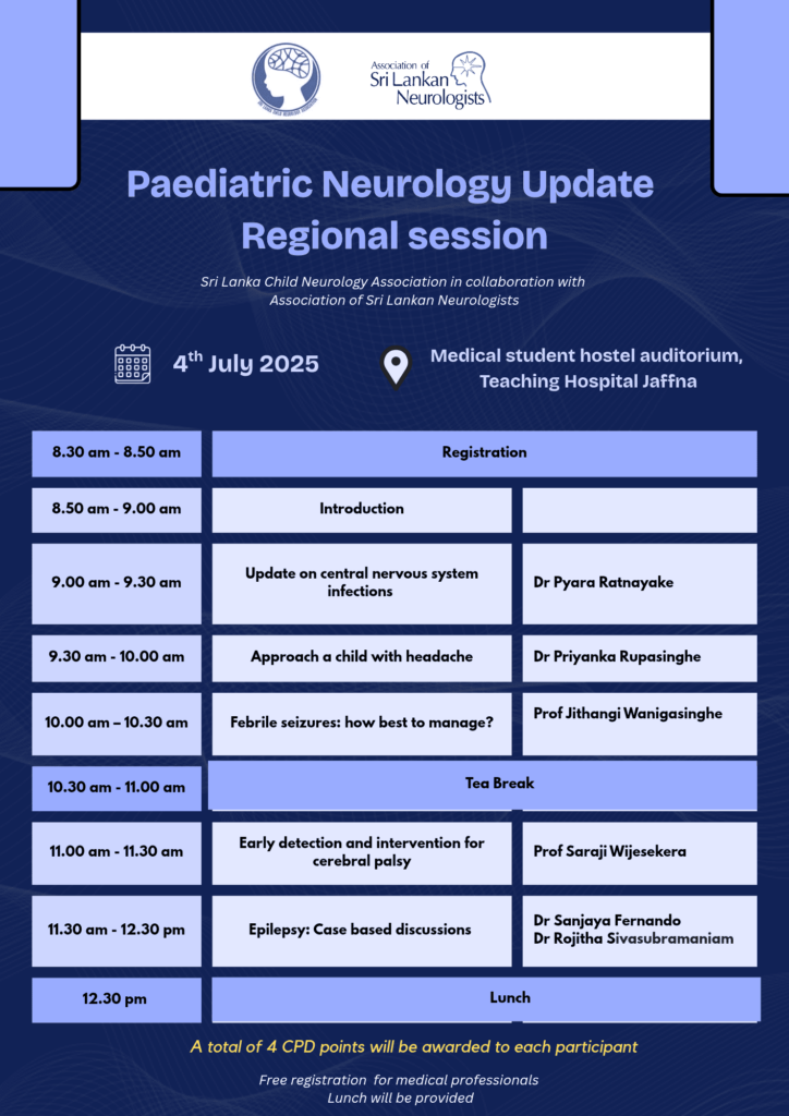 Regional meetings provide an opportunity to share knowledge on common topics in Neurology among medical professionals working in the peripheries of Sri Lanka. A team of neurologists of the ASN make the trip to a selected hospital (outside Colombo) and talk on topics in Neurology which are current and relevant to medical practitioners practising in the periphery.