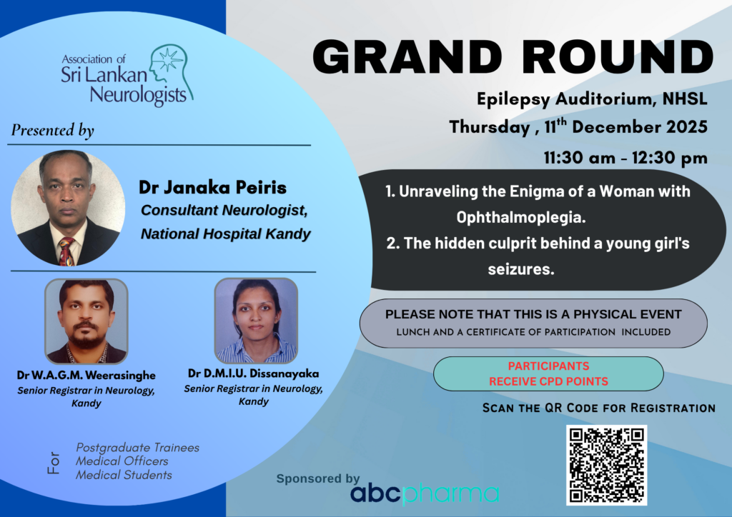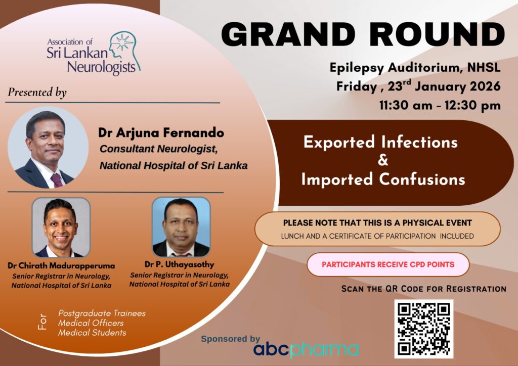 The Association of Sri Lankan Neurologists conducts a series of monthly Grand Rounds at the ClinMARC Auditorium of the National Hospital of Sri Lanka.