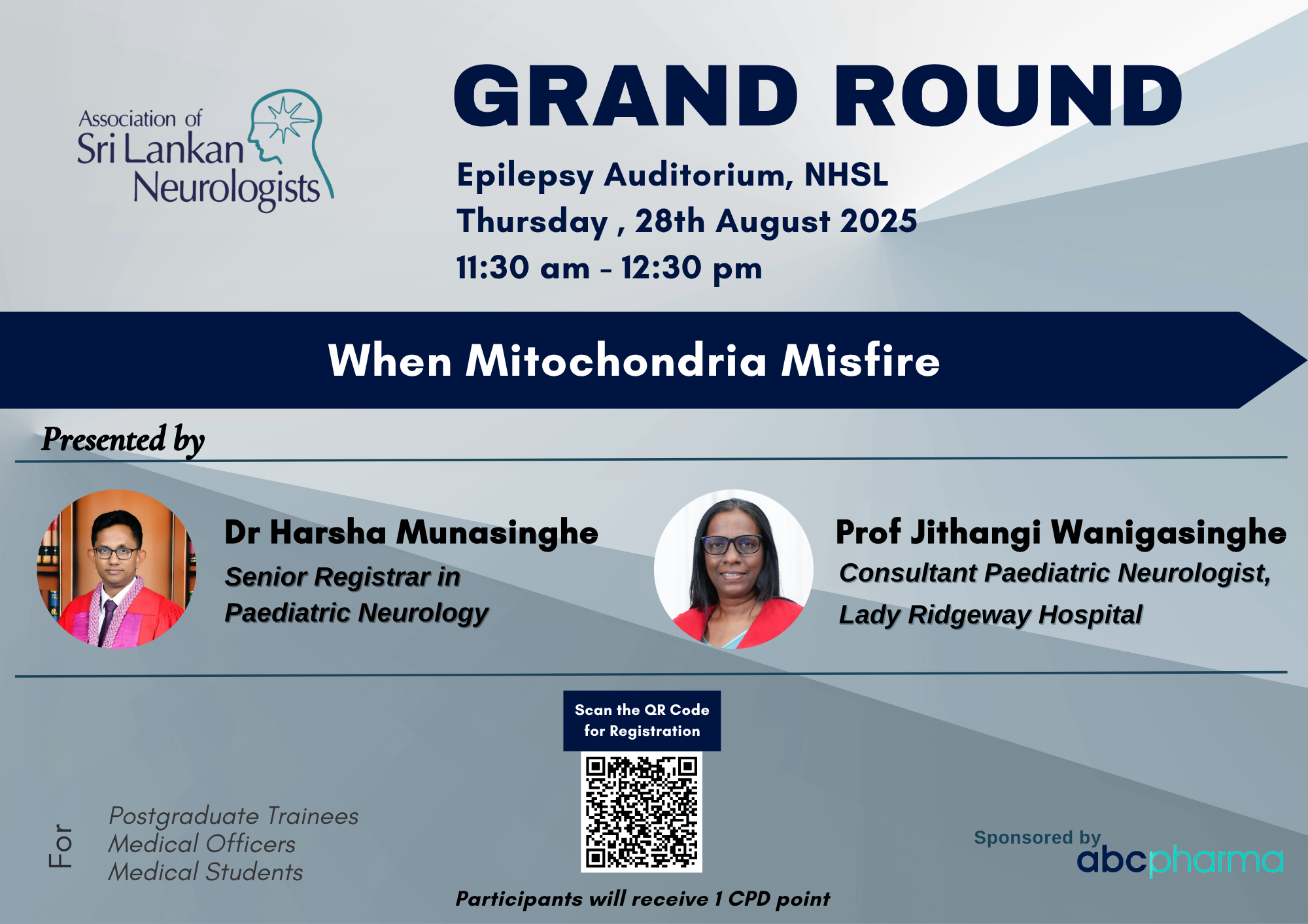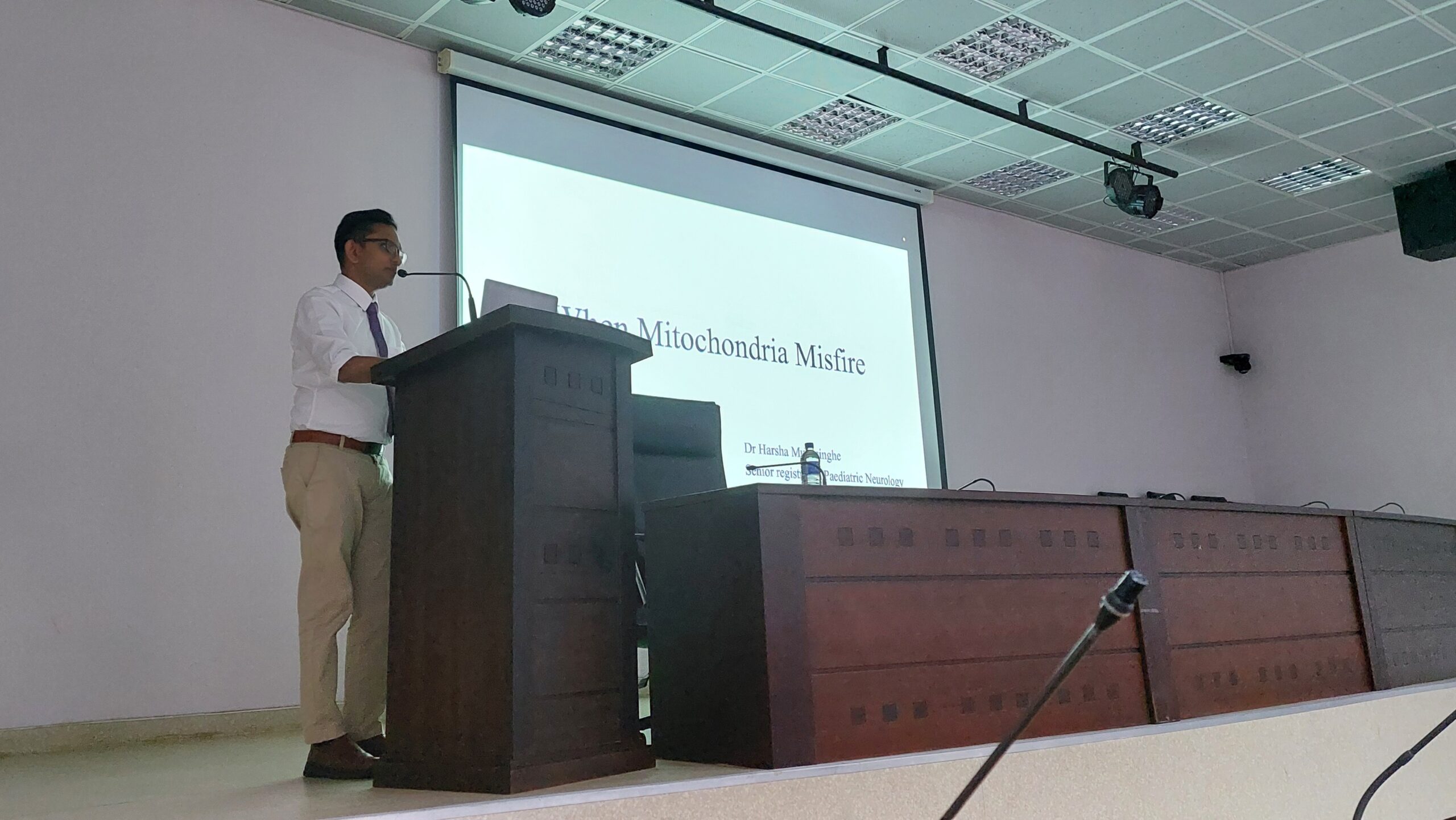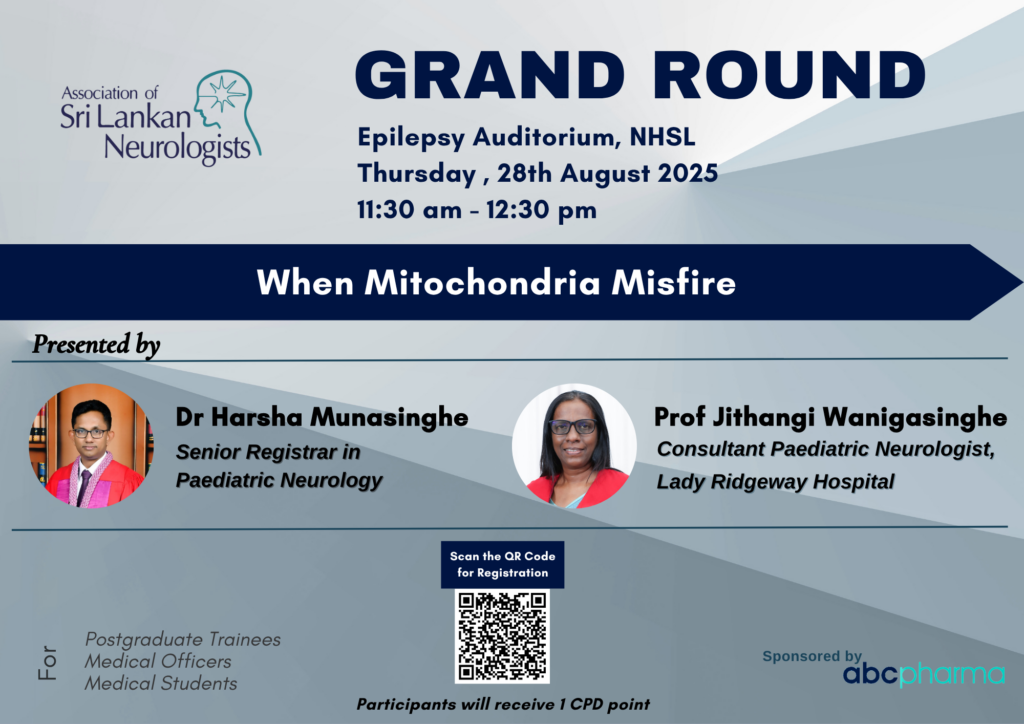 The Grand Round held on 28th August 2025 at the Epilepsy Auditorium, National Hospital of Sri Lanka, brought together experts and trainees for an in-depth discussion on “Mitochondrial Diseases in Childhood – When Mitochondria Misfire.” Prof. Jithangi Wanigasinghe from the Faculty of Medicine, University of Colombo, and Dr. Harsha Munasinghe, Senior Registrar in Paediatric Neurology at LRH, delivered insightful presentations on the diagnosis and management of these complex paediatric conditions. The session sparked meaningful discussion and was well-received by a diverse audience of clinicians and medical trainees.